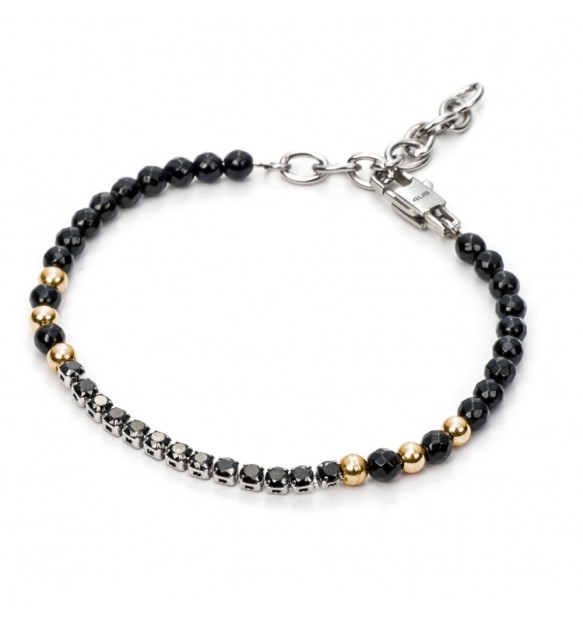 Braccialetto da uomo realizzato in acciaio anallergico dorato con grani sfaccettati in ematite nera lucida e centrale impreziosito da zirconi neri.