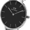 Orologio solo tempo da donna di Daniel Wellington della collezione petite sterling. Modello in acciaio inox lucidato 316l con cassa della dimensione di 36mm. Il quadrante è di colore nero con indici a bastoni e due lancette. Il cinturino è in maglia milanese di colore argento. Orologio con movimento al quarzo e resistenza all’acqua di 3atm (resistente anche alla pioggia). La referenza è dw00100304