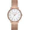 Orologio solo tempo da donna di Michael Kors della collezione Pyper. Modello con cassa rotonda del diametro di 38 mm in acciaio inossidabile di colore rose gold con finitura lucida e spessore di 7 mm. Orologio con vetro trasparente, quadrante di colore bianco, ghiera in acciaio inossidabile di colore rose gold con finitura lucida. Modello impreziosito da cristalli sul quadrante,cinturino di tipo bracciale mesh in acciaio inossidabile di colore rose gold con finitura lucida, chiusura a scatto e distanza delle anse di 18 mm. Orologio con movimento al quarzo e 3 sfere e resistenza all’acqua di 5 ATM. La referenza è MK4392