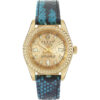 Orologio solo tempo da donna della collezione queen di Philipp Plein. Orologio solo tempo con cassa realizzata in acciaio inossidabile di colore ip oro giallo. Dimensione cassa: 36 mm. Il quadrante è oro. Il cinturino è realizzato in elaphe leather di colore azzurro. Il movimento è quarzo 3 h. La resistenza all’acqua è 5 atm. La referenza è pwdaa0221