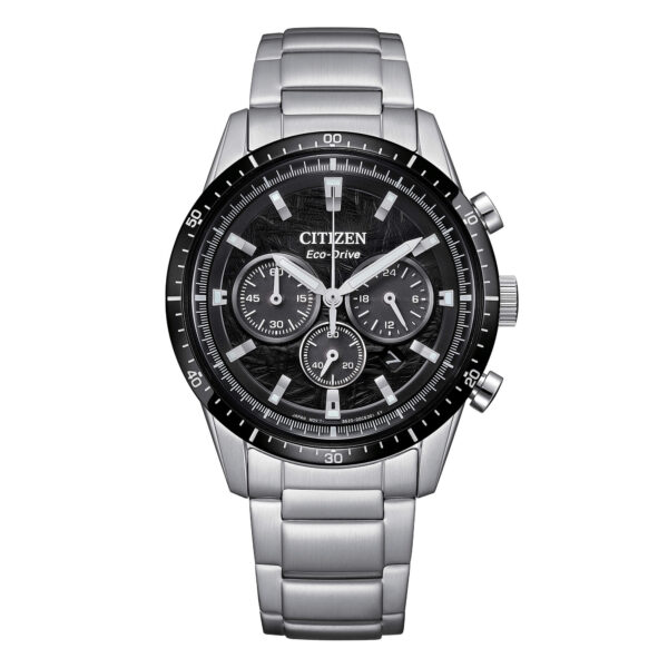Orologio da uomo del brand Citizen della collezione Crono 39. Orologio cronografo con cassa in acciaio con fondo serrato a vite diametro cassa 39 mm e vetro minerale. Quadrante nero a effetto meteorite e con indici applicati e ghiera nera e bracciale in acciaio con chiusura a pulsante. Movimento eco drive con riserva di carica di 7 mesi cal b620, resistenza all’acqua: 10 ATM. Datario: sì. La referenza è CA4624-56E