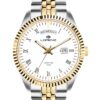 Orologio da uomo solo tempo. Cassa rotonda in acciaio bicolore diametro 40 mm. con fondello a vite e vetro minerale. Cinturino in acciaio bicolore e chiusura a farfalla. Movimento al quarzo Miyota 2350 day date. Resistente all’acqua fino a 5 atmosfere